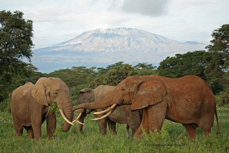 ELEPHANT 8 - Elephants with Mount Kilimanjaro in the Background: African elephant societies are arranged around family units. Each family unit is made up of around ten closely related females and their calves and is led by an older female known as the matriarch. |