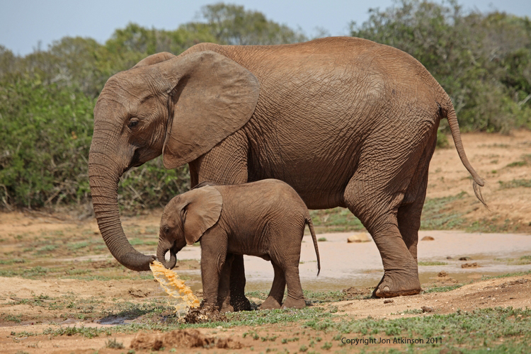ELEPHANT 18 - Elephant, Kruger N.P., South Africa: Elephants are at their most fertile between the ages of 25 and 45. Calves are born after a gestation period of nearly two years. The calves are cared for by their mother and other young females in the group, known as allomothers. |