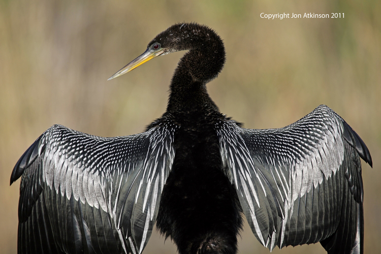 Florida2 - Anhinga, Everglades N.P.: Anhingas use their sharp bills to spear fish, flip them in the air and swallow them head-first. Sometimes they pierce them so hard that they have to return to shore with the fish still on their bill, and bang the fish off on a rock. The Anhinga typically nests in loose groups of several to hundreds of pairs and sometimes with other colonial water birds. The nest is usually in a tree near to water or overhanging it. |