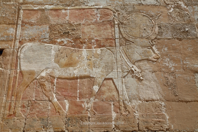 Hatshepsut 12 - Hieroglyphics in Temple of Dier el Bahari: Hathor is commonly depicted as a cow goddess with head horns in which is set a sun disk. Hathor was worshiped by Royalty and common people alike in whose tombs she is depicted as “Mistress of the West” welcoming the dead into the next life. |