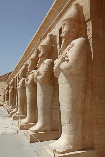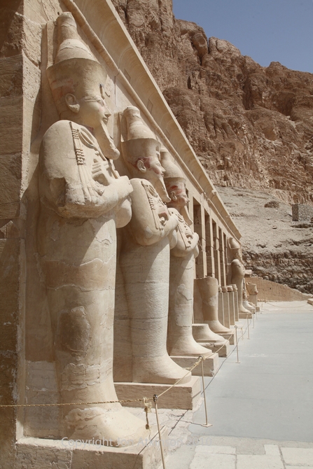 Hatshepsut 4 - Columns on the left of the upper terrace: Osiride columns of Queen Hatshepsut on the left hand side of the third terrace of her mortuary temple at Deir el-Bahri. note the mummification shroud enclosing the lower body and legs as well as the crook and flail associated with Osiris.