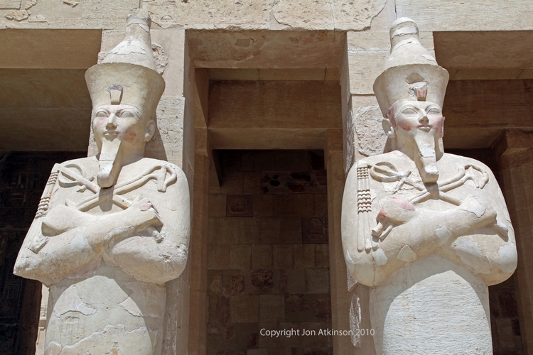 | Hatshepsut 5 - Columns on the the upper terrace:Close up of two Osiride columns of Queen Hatshepsut on the third terrace of her mortuary temple at Deir el-Bahri. |