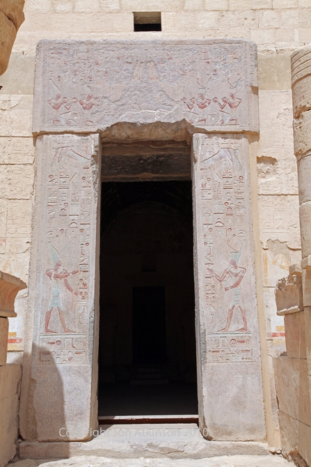 Hatshepsut 7 - Entry to the Sanctuary of Amun, Temple of Deir el Bahari: The Sanctuary would have been the resting place for the barque of Amun during the Valley Festival. The sanctuary was later expanded by Ptolemy VIII, Euergetes who added a third chamber dedicated to Imhotep and Amenhotep Son of Hapu who were worshipped as deities at this time and associated with gods of healing. The third terrace later became a sanatorium. |