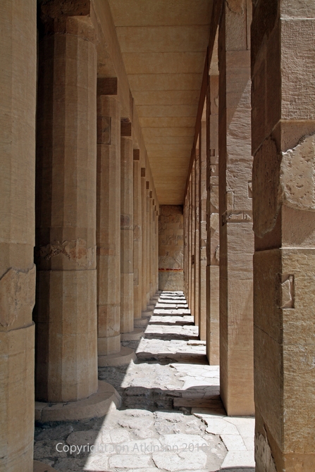 Hatshepsut 9 - Rear view of Columns on the Upper terrace, Temple of Deir el Bahari: The second ramp leads to the uppermost terrace. A long solemn row of identical Osiris statues of the queen forms the facade fronting the square pillars of the main hall. The Osiris statues had been changed to the square pillars by Tuthmosis III after Queen Hatshepsut had died to erase her from his mind. This creates an unusual corridor bordered by circular and square pillars. |