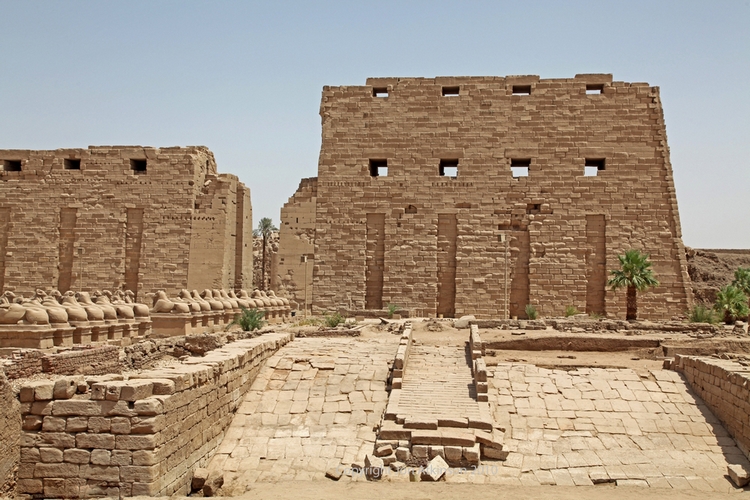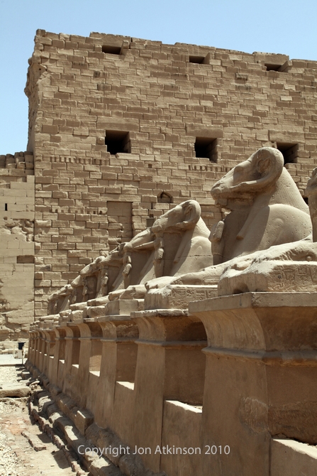 Karnak 2 - Avenue of Ram-headed Sphinxes Karnak Temple: The avenue of sphinxes consist of statues with lions' bodies and the heads of rams, symbolizing Amun built around 656 BC. Originally there were three avenues of sphinxes, the longest was two miles long which linked to the avenue of human-headed sphinxes of the temple of Luxor. |