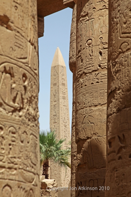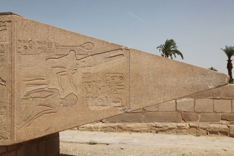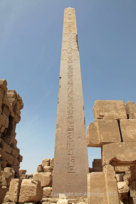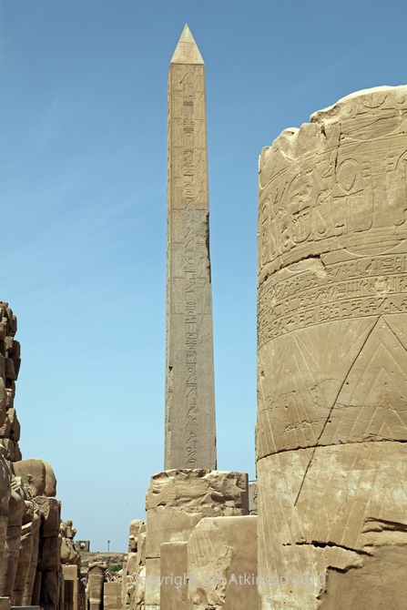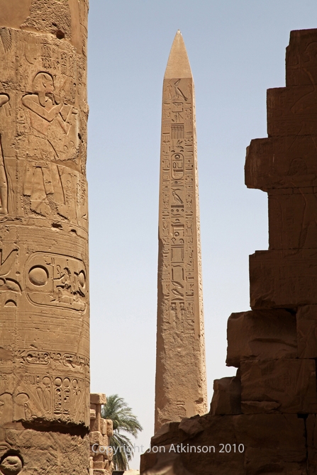 Karnak 10 - "Obelisk of Thutmose, Karnak Temple: The use of the obelisks is a mystery. Whilst obelisks are usually covered with inscriptions, these offer no clue to their function, but are instead an indication of by whom and when the obelisk was carved. One theory suggests that the erection of the obelisk was a symbol representing the channel through which the divine spirit might rise to rejoin its source. |