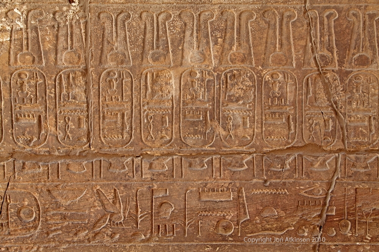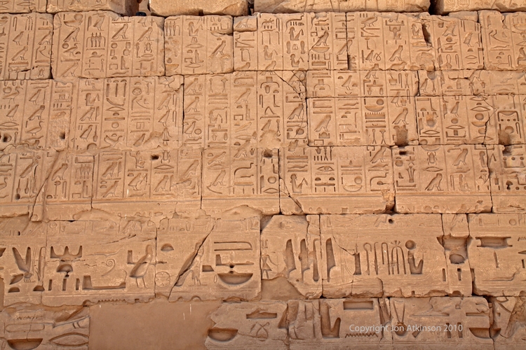 Karnak 15 - Hieroglyphs in Temple of Ramesses III: Hieroglyphs on the wall of the Temple of Ramesses III in the Karnak temple complex. |