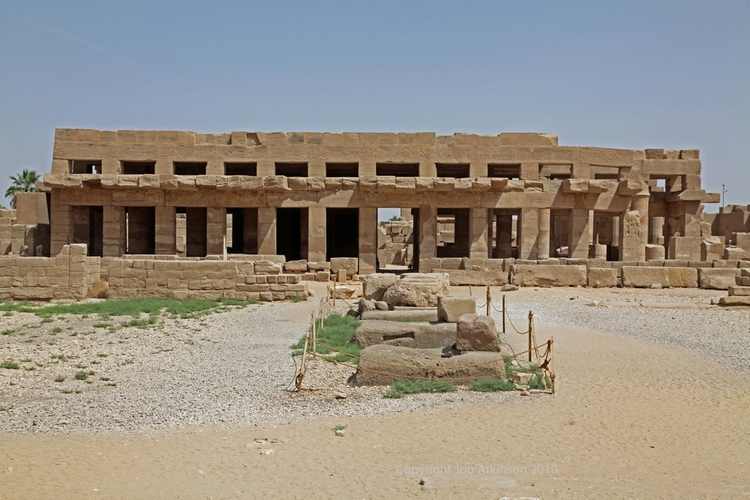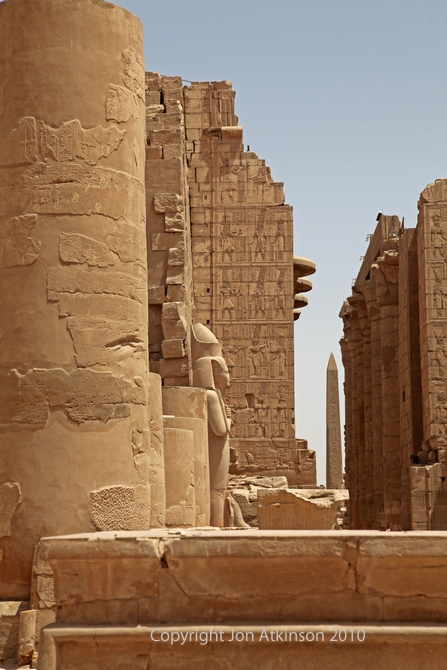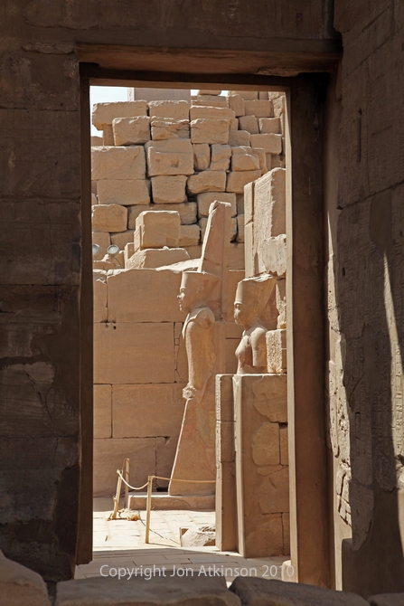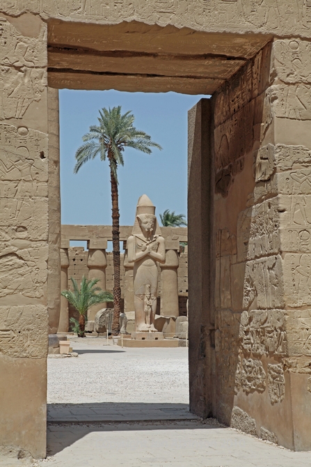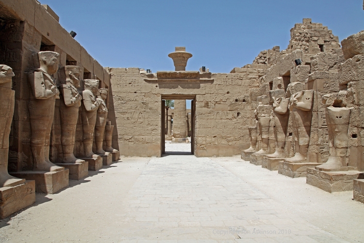 Karnak 16 - Temple of Ramesses III, Karnak Temple Complex: Looking back towards the Great Court from the Temple of Ramesses III. Each side of the Courtyard has a covered passage with eight square pillars fronted by Osiris figures whilst its walls show festival scenes and texts. |