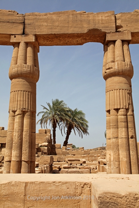 Karnak 20 - Papyrus Capital Colonnade, Karnak Temple Complex: In this photo you can see a colonnade with papyrus capitals. The capitals shown here are closed buds, but they can also be found in an open wide bell-shaped form. |