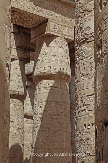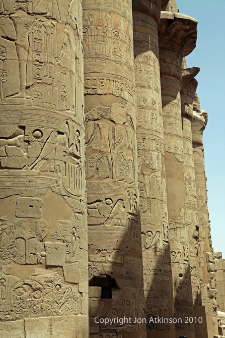 Karnak 21 - Pillars of the Great Hypostyle Hall from precinct of Amun-Re: Seti I carved his beautiful raised reliefs around the walls of the northern half. His son Ramesses II completed the decoration of the southern half of the walls and pillars, often over carving his father’s reliefs with his own crude sunk relief carvings. |