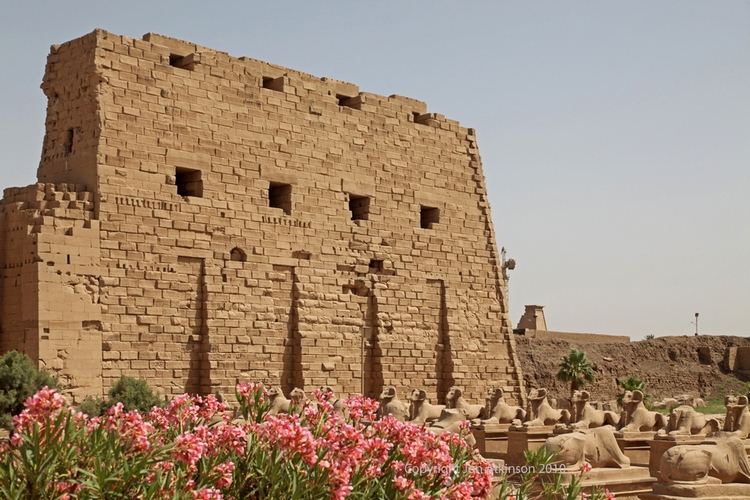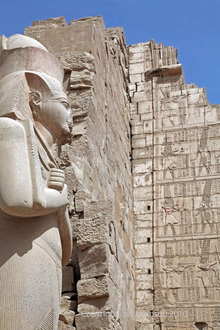 | Karnak 5 - Second Pylon at Entrance to the Hypostyle Hall, Karnak Temple Complex: The second pylon was built by Horemheb but not completed until the reign of Seti I. Seti’s son Ramesses II built two colossal statues of himself which stood in front of the pylon gate. |