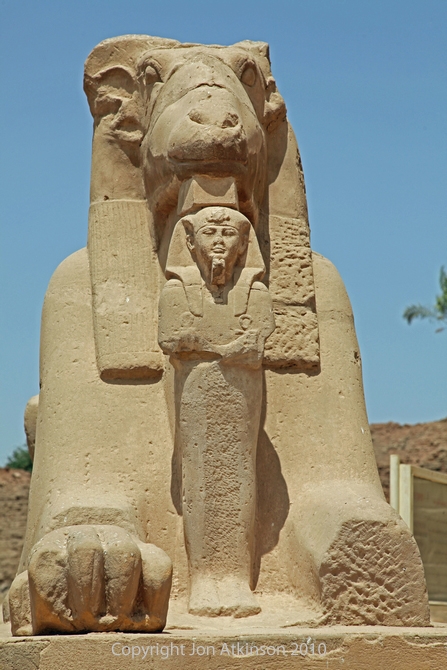 Karnak 9 - Sphinx, Karnak Temple: Each Sphinx along the corridor that leads to the first pylon is depicted with a royal effigy of Ramesses II, in the form of Osiris, protected between their front paws. |