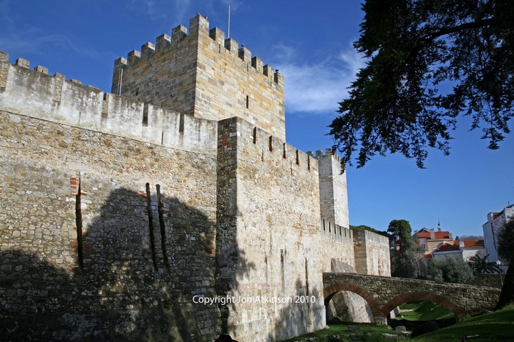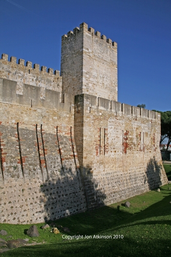 | Lisbon_Sights5 - Exterior of Castle of São Jorge, Lisbon: Conquered from the Moors in 1147 with the help of northern European crusaders on their way to the Holy Land, Saint George Castle has an area of around 6000 square metres with several towers, look-outs, a dry moat and two squares divided by an internal wall with a connecting door. It was dedicated to St. George, the patron saint of England, commemorating the Anglo-Portuguese pact dating from 1371. |
