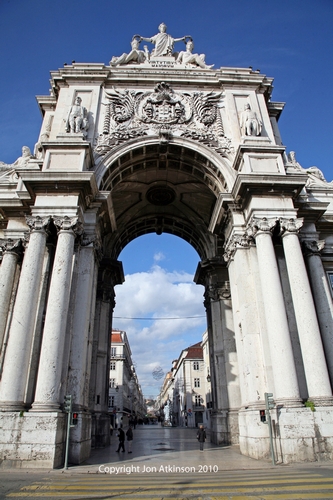 Lisbon_Sights1 - Commerce Square, Lisbon: Opening towards the Augusta Street, which links the square with the other tradicional Lisbon square, the Rossio, the original project by Eugénio dos Santos planned a triumphal arch, only realised in 1875. This arch, usually called the Arco da Rua Augusta, was designed by Veríssimo da Costa. |