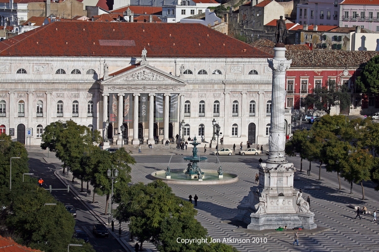 Lisbon_Sights12 - Rossio Square, Lisbon, Portugal: The Dona Maria II National Theater, a monumental 1840s neoclassical building dominates the North side of the Rossio Square. In the center is a monument measuring 27 meters in height it consists of a pedestal with marble allegories of Justice, Wisdom, Strength, and Moderation, qualities attributed to Dom Pedro IV, whose statue stands on top of the monument. |