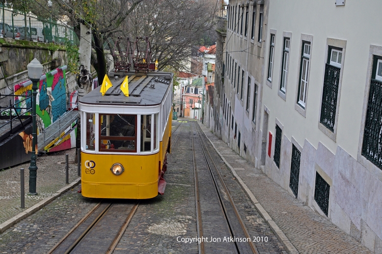 Lisbon_Sights11 - Glória Funicular, Lisbon, Portugal: The Glória Funicular is one of the funiculars existent in Lisbon, right downtown, most precisely on the Restauradores Square. It makes the connection between this square and Bairro Alto on a 265 metres journey up or down the hill. |