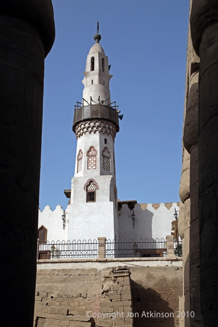 Luxor 10 - Abu Haggag Mosque over pharaonic temple: The Luxor Temple lay covered with sand and silt for centuries. The Romans built a village on the site in the 3rd century, using the temple walls as its boundaries. When the the pharaonic temple was unearthed and rediscovered in the late 19th century by archaeologist Gaston Maspero it lay under a village. The village built on the site of the Luxor Temple was moved, but the 14th century Abu al-Haggag Mosque was left intact. |