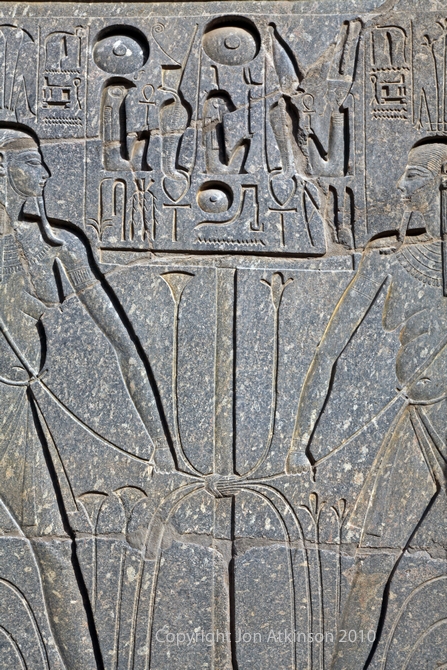 Luxor 11 - Relief in the Great court of Ramesses II: The walls of the court or Ramesses II are covered with reliefs and inscriptions, representations of offerings, hymns to the gods, scenes showing conquered nations mostly dating from the reign of Ramesses II. |