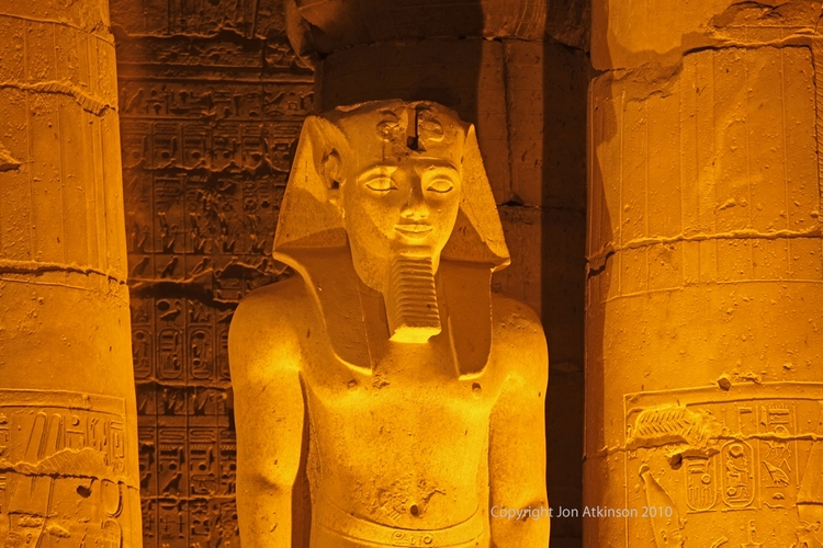 Luxor 6 - Illuminated Statue of Ramesses II: The entrance to the the colonnade is two statues purported to be of Ramesses II, however both of these bear the features of the young king Tutankhamen.