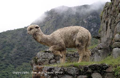 South American Wildlife 12 - Alapaca, Machu Picchu, Peru: An alpaca (Vicugna pacos) is a domesticated species of South American camelid. It resembles a small llama in appearance. Alpacas are kept in herds that graze on the level heights of the Andes of southern Peru, northern Bolivia, Ecuador, and northern Chile at an altitude of 3,500 m (11,500 ft) to 5,000 m (16,000 ft) above sea level, throughout the year. |