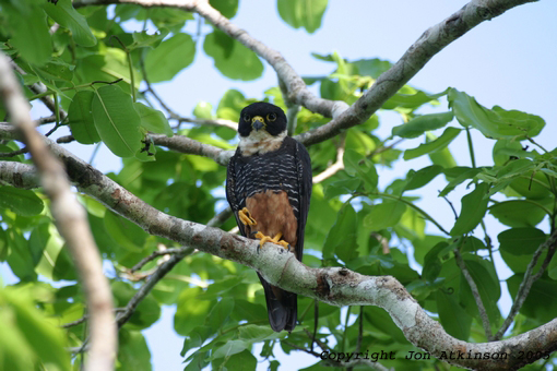 South American Wildlife 3 - Bat Falcon, The ARC, Peru: The bat falcon (Falco rufigularis) is a falcon that is a resident breeder in tropical Mexico, Central and South America and Trinidad. They hunt bats, birds and large insects such as dragonflies. The smaller male takes more insects, and the female more birds and bats. The flight is direct and powerful. This falcon is partly crepuscular, as the bats in its diet suggest. |