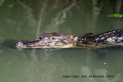 South American Wildlife 2 - Caiman, back Waters, Costa Rica: Caimans inhabit Central and South America. They are relatively small crocodilians, with the smallest being Cuvier's dwarf caiman (Paleosuchus palpebrosus), which grows to 1 m (3 ft) long, and the largest being the black caiman (Melanosuchus niger), which can grow to 4 m (13 ft) or more. |