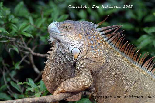 South American Wildlife 8 - Iguana, Costa Rica: Iguana is a genus of herbivorous lizards native to tropical areas of Mexico, Central America, and the Caribbean. Iguanas can range from 5 to 6 feet (1.5 to 1.8 m) including their tail. The two species of lizard within the genus Iguana possess a dewlap, a row of spines running down their backs to their tails, and a tiny "third eye" on their heads. |