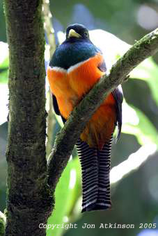 | Trogon, Montiverde N.P., Costa Rica: The trogons and quetzals are birds in the order Trogoniformes which contains only one family, the Trogonidae. Trogons are residents of tropical forests worldwide where they feed on insects and fruit, and their broad bills and weak legs reflect their diet and arboreal habits. |
