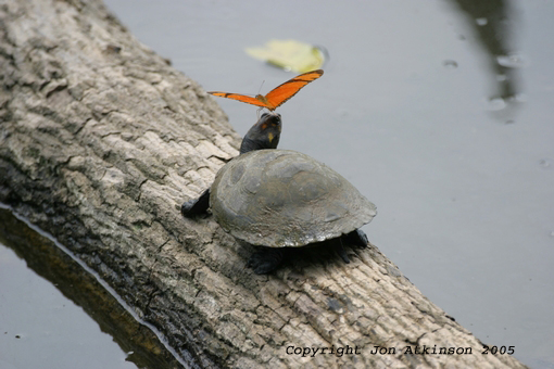 South American Wildlife 4 - Yellow Spotted Side-necked Turtle: inadvertently attracts a Long-winged Butterfly, which is attracted to the salt from the turtles tears in the Amzzon rainforest in Peru.