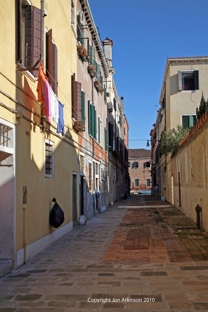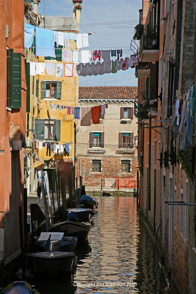 Venice_17 Laundry Drying, Venice Laundry hanging on a washing line above a canal on one of the islands in the Venetian lagoon. |