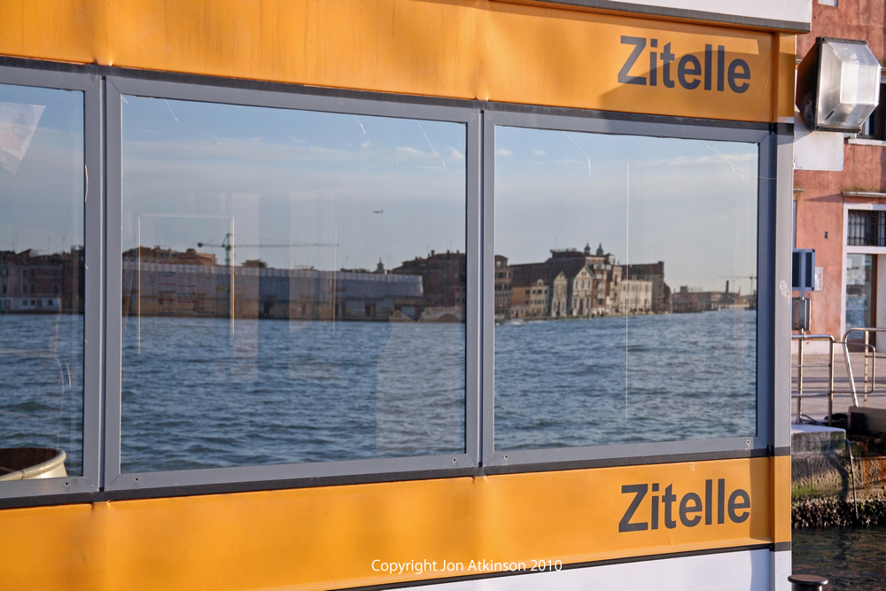 Venice_18 Vaporetto (Waterbus) Stop, Venice All transportation within Venice is entirely by water or on foot. In this image the reflection of the Venice skyline on the opposite river bank is seen reflected in the window on the Zitelle Vaporetto Stop. |