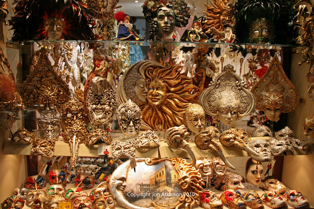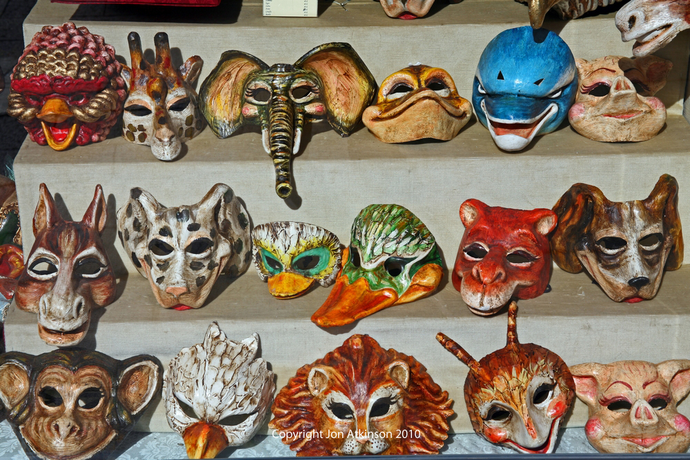 Venice_7: Venetian Masks Traditionally masks served an important social purpose of keeping every citizen on an equal playing field. Masked, a servant could be mistaken for a nobleman - or vice versa. Today many shops sell them as souvenirs to the many visitors to Venice |