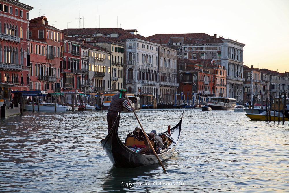 Venice_8 Gondolier on the Grand Canal, Venice, Italy Gondolas are hand made using 8 different types of wood (fir, oak, cherry, walnut, elm, mahogany, larch and lime) and are composed of 280 pieces. The oars are made of beech wood and the left side of the gondola is made longer than the right side to counterbalance the weight of the gondolier. |
